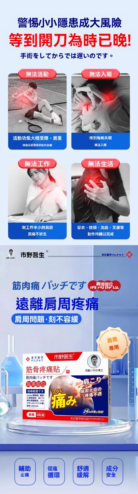 5分鐘前市野醫生緩解關節疼痛肩周貼,多種原材合理搭配製成,柔軟貼合,長時貼敷、深入肌膚呵護,早用早好。 - 【二療程 治療腿疼肩胛疼】買二送三-NT$1200