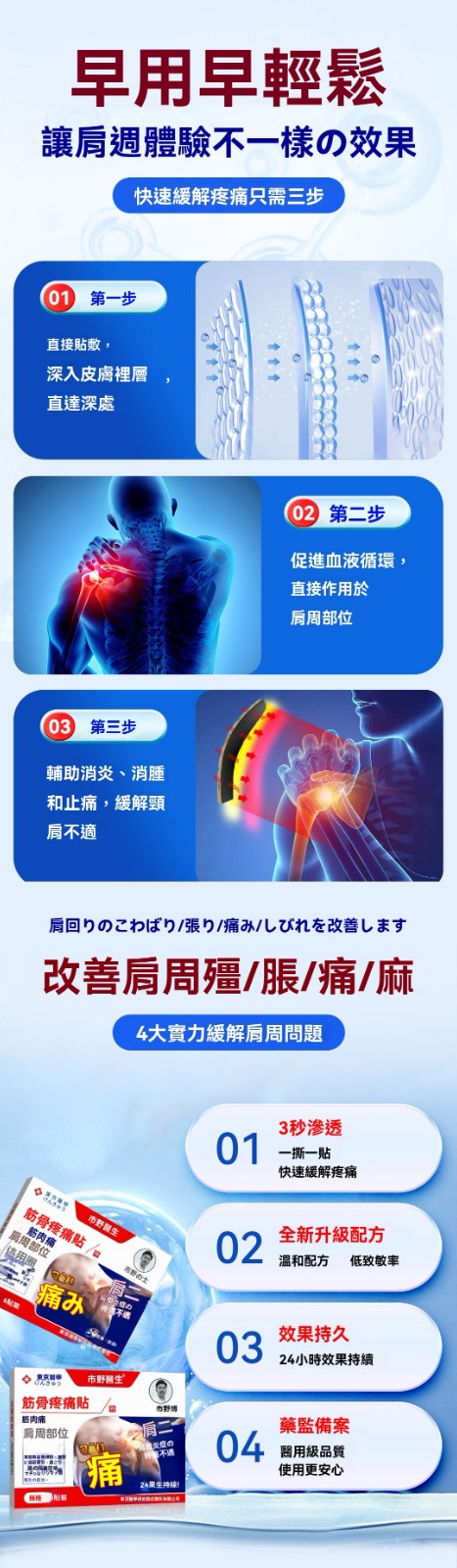 4分鐘前市野醫生緩解關節疼痛肩周貼,多種原材合理搭配製成,柔軟貼合,長時貼敷、深入肌膚呵護,早用早好。 - 【三療程 行走順暢不再疼痛】買三送四-NT$1400