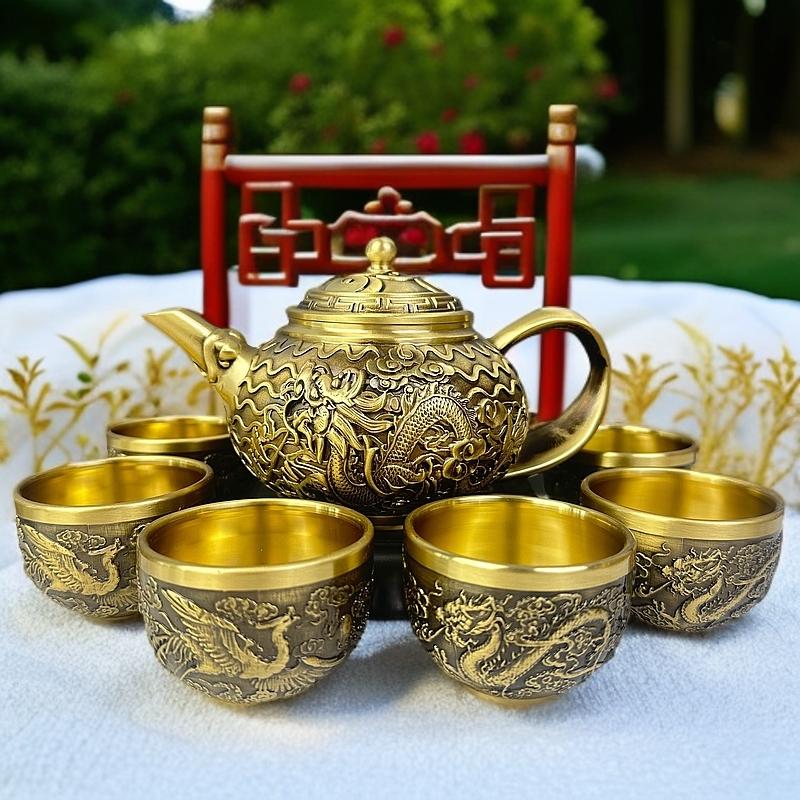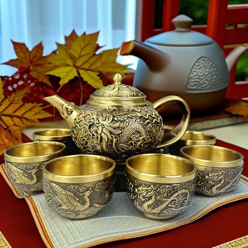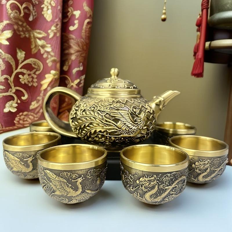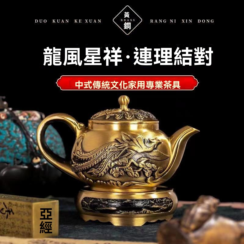 12分鐘前新款套裝【一壺八杯】中式浮雕黃銅龍鳳壺復古大容量龍嘴壺擺件 - 純黃銅茶具 龍鳳10件組【1茶壺8杯1底座】-NT$2698